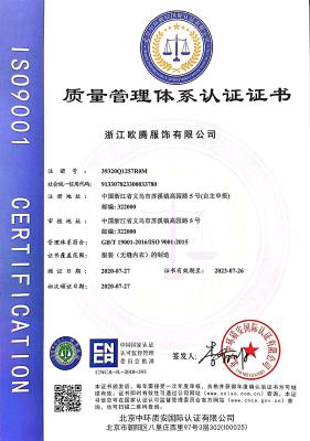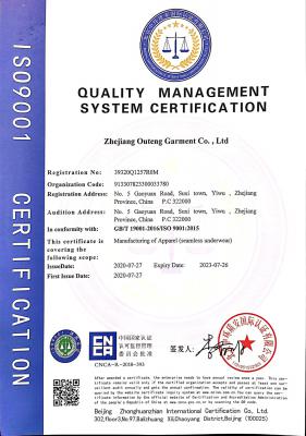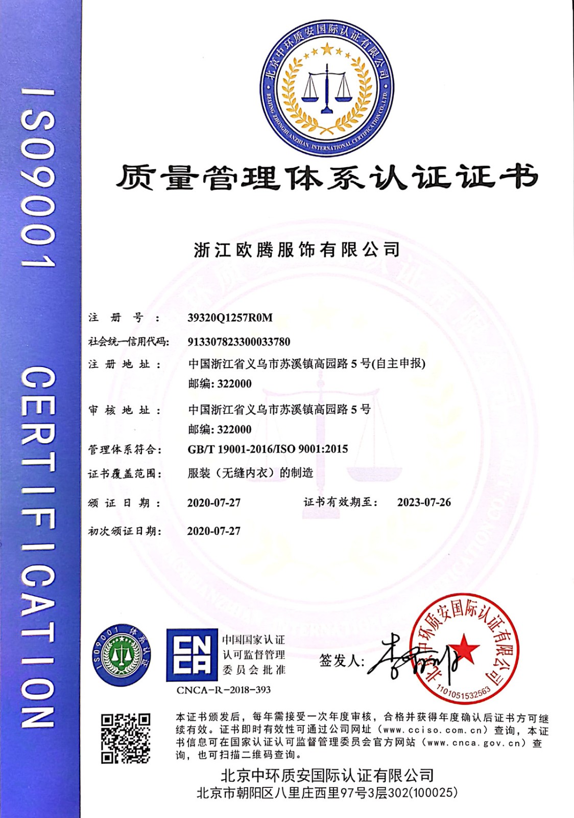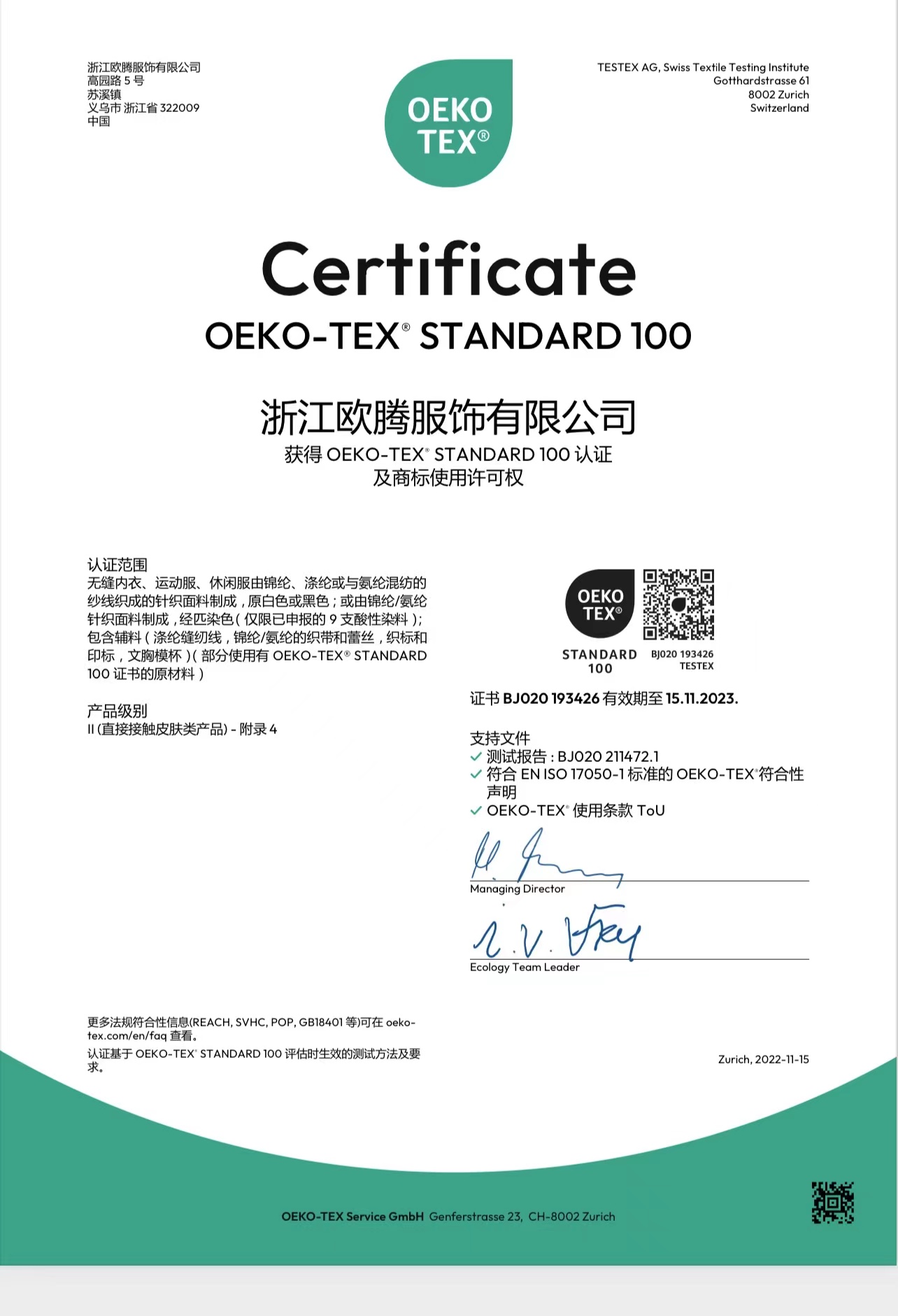 浙江歐騰服飾有限公司位于世界小商品之都-義烏。創(chuàng)立于2015年,是一家專業(yè)生產(chǎn)無縫針織運動服飾和內(nèi)衣的工貿(mào)一體企業(yè),擁有自主出口權(quán)。 工廠的占地面積約16000平方米 ,引進了大型圣東尼、高騰等多種先進的制衣設(shè)備300余臺。月產(chǎn)能可達90萬件。 歐騰服飾每年投入近百萬資金打樣開發(fā)新產(chǎn)品,有著一支高素質(zhì)設(shè)計、技術(shù)員工隊伍。工廠先后通過了ISO 9001質(zhì)量管理體系認(rèn)證、BSCI認(rèn)證、GRS認(rèn)證、OEKO-TEX國際生態(tài)紡織品認(rèn)證等多項專利檢測報告。可提供OEM&ODM服務(wù)。歐騰服飾以一套完整、科學(xué)的質(zhì)量管理體系,生產(chǎn)的服裝從原材料紗線到成衣,質(zhì)量完全能夠滿足國內(nèi)、國際質(zhì)量要求。獲得了客戶一致好評。工廠先后獲得省科技型企業(yè)、國家高新企業(yè)、義烏市誠信講信用單位、規(guī)上企業(yè)、信用AAA級等榮譽。